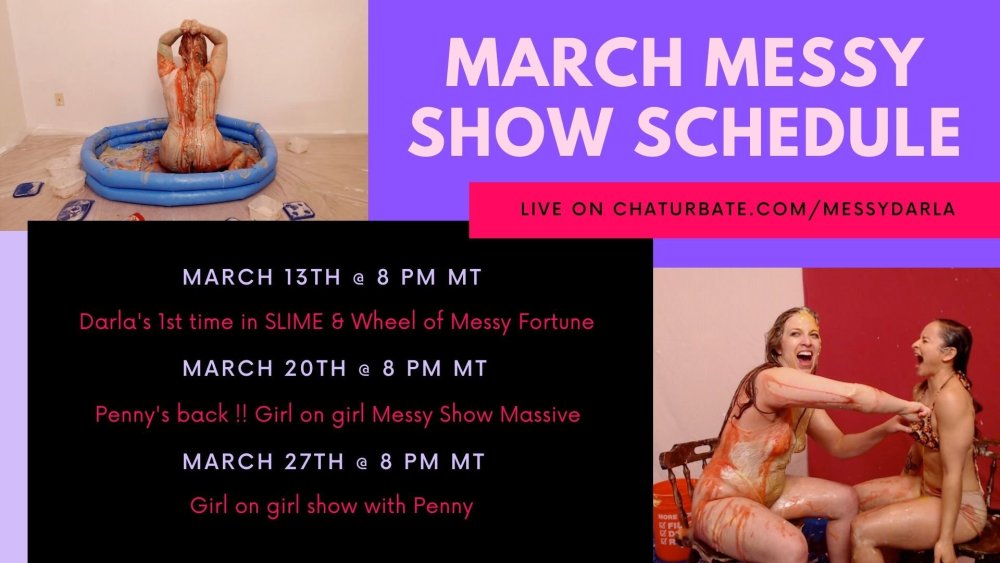 I'll be back on Chaturbate for a live messy slime show this Friday, March 13th. I'll be online from 8 pm - 2 am MT. It will be my first time getting drenched in slime and I seriously cannot wait :) we'll also be busting out my new Wheel of Messy Fortune.
