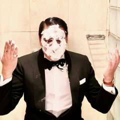 Gungemanc was surprised by Mattey with a big sloppy cream pie to the face